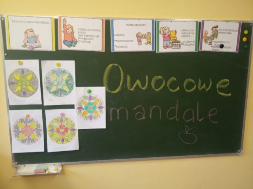 Oglądaliśmy prezentacje i zdrowym odżywianiu i układaliśmy z naszych ulubionych owoców mandale. Efekt był pyszny.